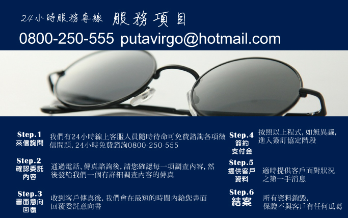 大陸徵信社標準服務流程相信許多人對於徵信社的接案服務流程,感到非常有興趣,因為一般外人,對於徵信社內部的辦案流程真的是不了解,所以在遇到問題時,會陷入不知所措的慌亂情況,因此,立達徵信社決定公開大陸信社的辦案流程,讓所有人能夠對於大陸徵信社的標準服務流程,進行了解。 步驟一:我們有24小時線上客服人員可讓您免費諮尋各項有關徵信的問題,諮詢電話:0800-250-555。 步驟二:透過電話、傳真諮詢後,請您確認每一項調查內容,然後發給我們一個有詳細調查內容的傳真。 步驟三:收到客戶傳真後,我們會在最短的時間內給您一個肯定的回覆,並以書面回覆您委託意向書。 步驟四:若您對於合約、委託書沒有任何的異議,即建立簽約的階段。 步驟五:提供給客戶最新的案件消息。 步驟六:當案件結束之後,大陸徵信社將會將所有資料進行銷毀,我們保證將來與客戶絕無任何瓜葛。 大陸徵信社-大陸徵信社有完善的SOP服務流程,但也提供彈性的客制化服務,以客為尊,若您需要立達徵信社旗下的大陸信社為您提供徵信服務,請您即刻拿起您手邊的電話,直接撥打0800-250-555來電進行商討。 |